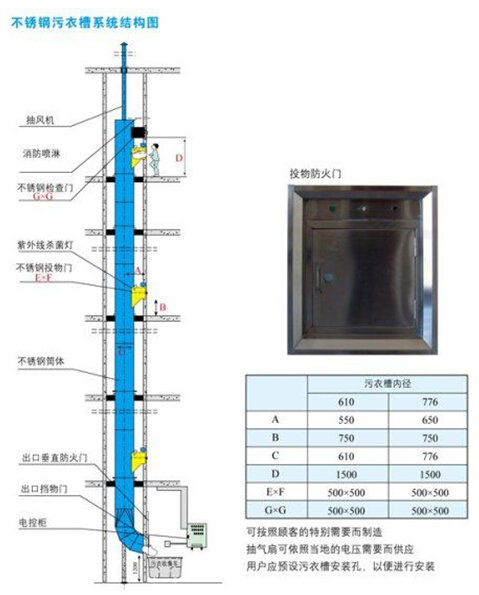污衣井是采用進口優(yōu)質不銹鋼加工焊接而成。槽管以角形圓環(huán)接口結合,允許各層樓的槽管在高度上的尺寸和冷縮熱脹的情況。在每一層樓,槽管以鍍鋅鐵地臺固定架支承,并用螺栓錨固于地臺上。污衣井在所需的樓層提供的投物門為側鉸、雙層門,可以加配電控門鎖,也可以人手操作。